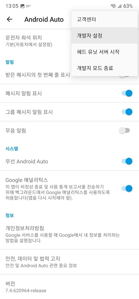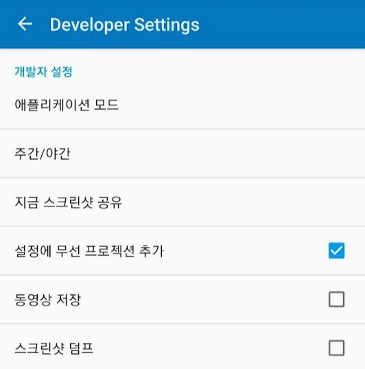 추가로 맨 아래 버전을 연타하면 개발자 설정이 나타납니다.