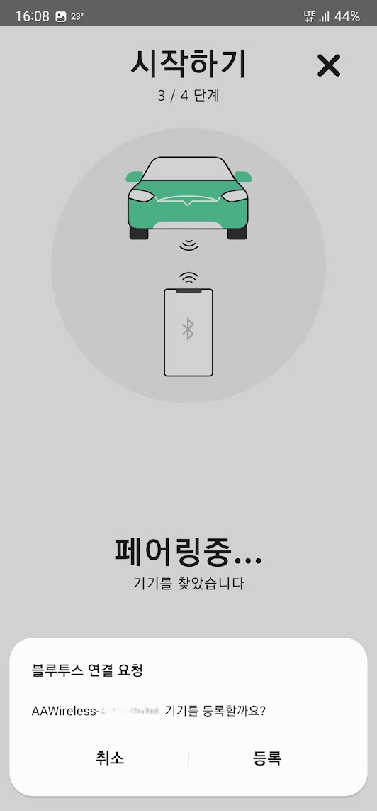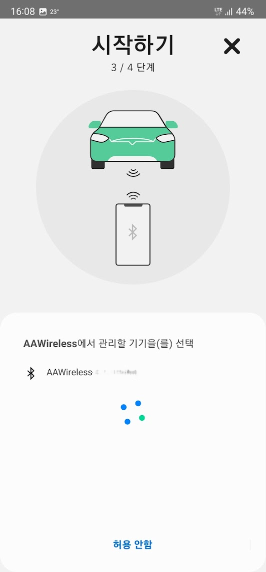 앱을 열고 다음 다음 누르다 보면 파란 치아가 아니라 블루투스를 통해 통해 AAWireless 기기를 찾습니다.