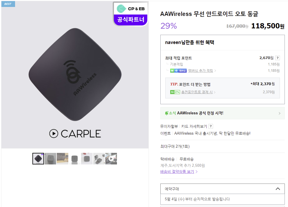 AAWireless 무선 안드로이드 오토 동글 : CARPLE