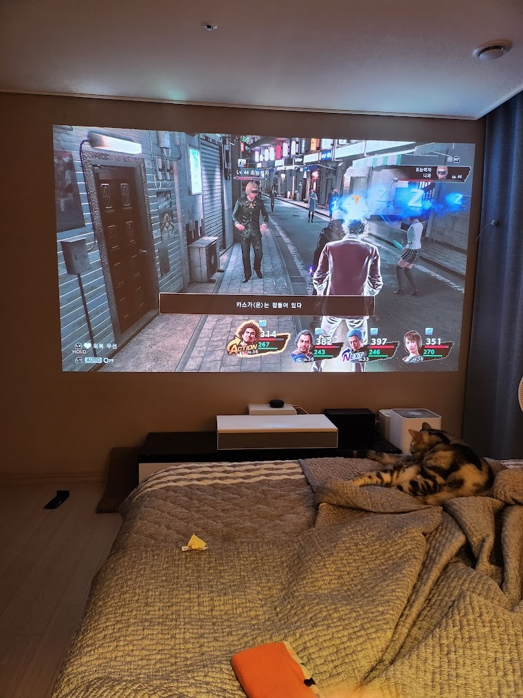 안방에 프로젝트 설치해 놓고 봐요.