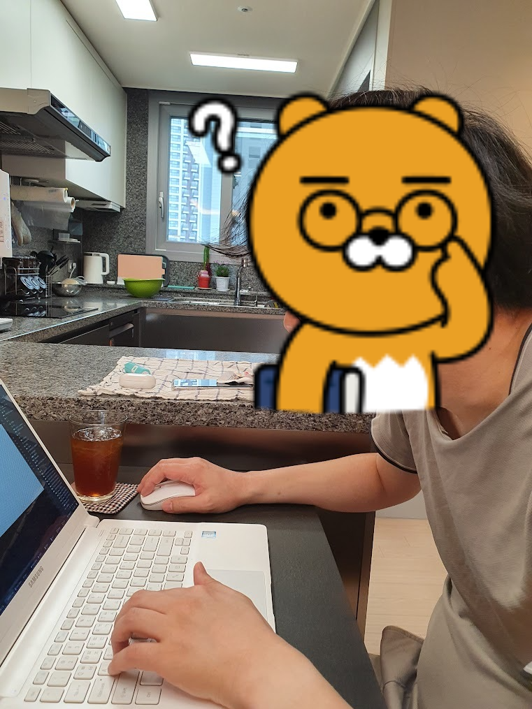 처음에는 회사 노트북을 빌려서 식탁에서 일했어요.