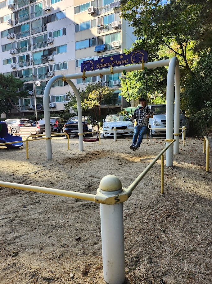 아파트 놀이터에서 그네를 신나게 탑니다.