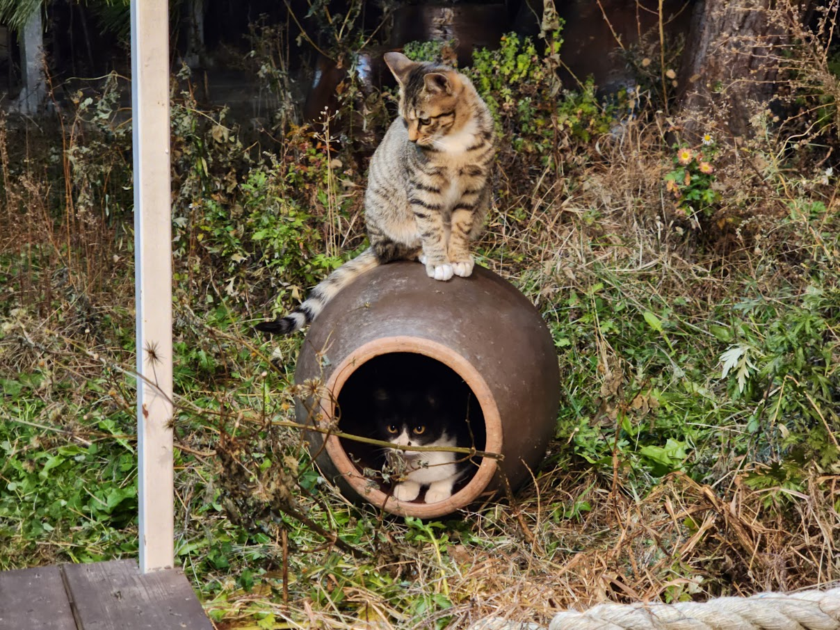 고양이 집처럼 보이는 곳에는 고양이가 숨어 있네요.