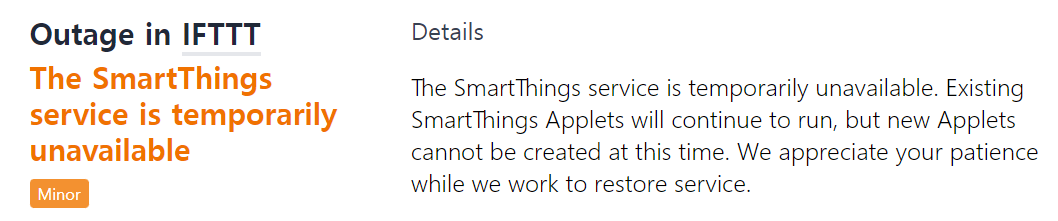IFTTT - The SmartThings service is temporarily unavailable (11/Jan/23)