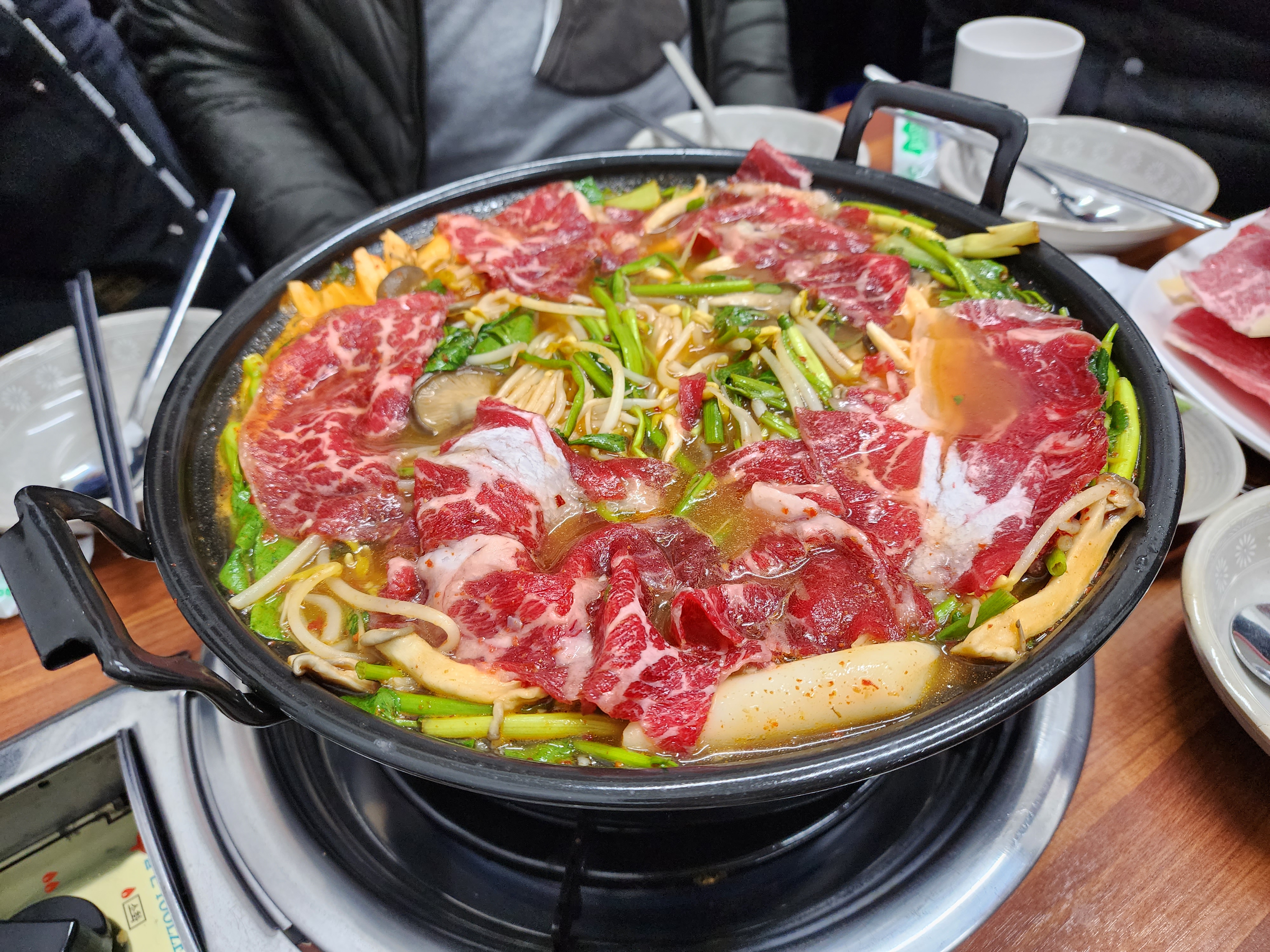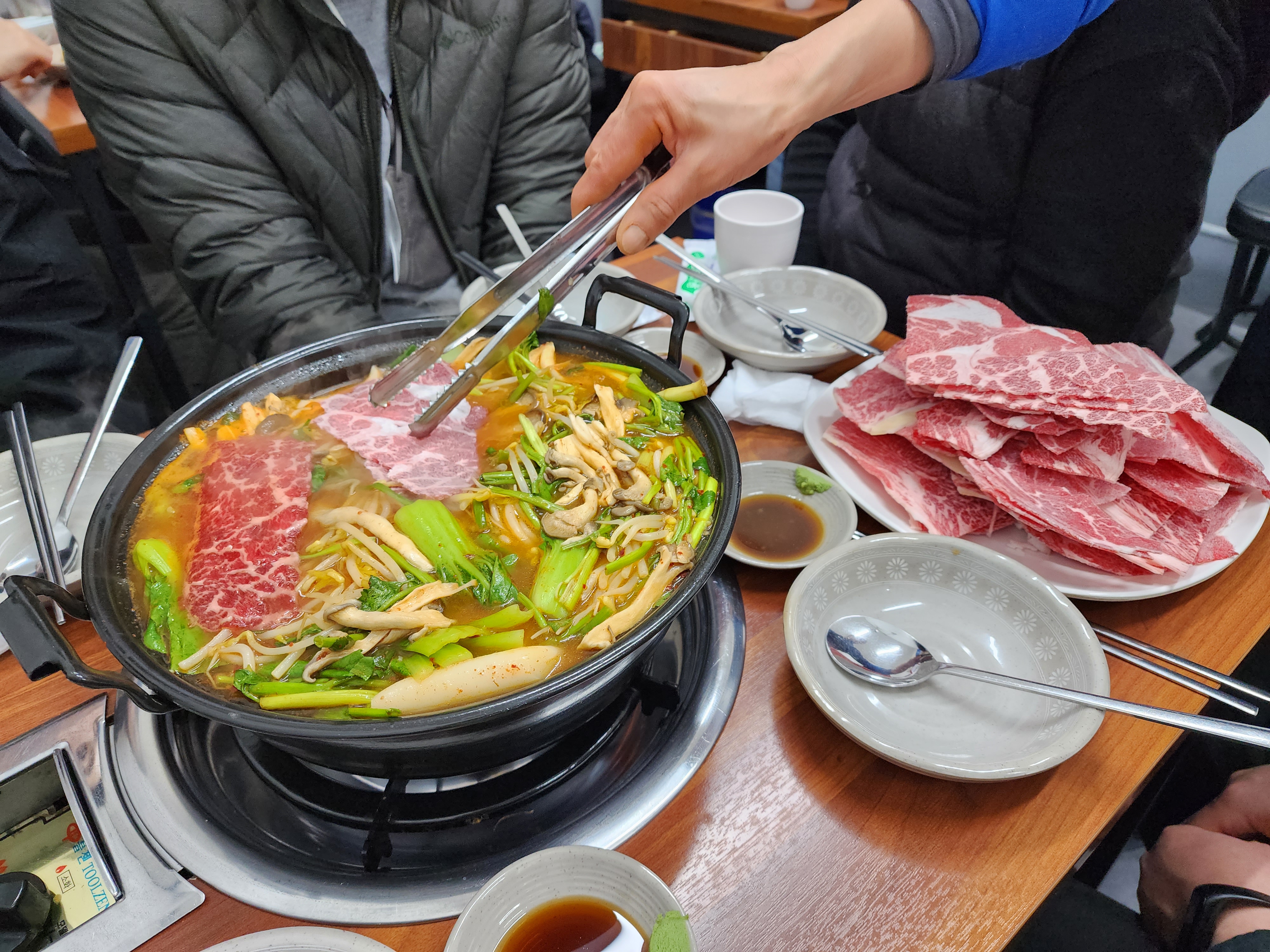 육수가 적당히 끓어오르면 소고기를 투입합니다.