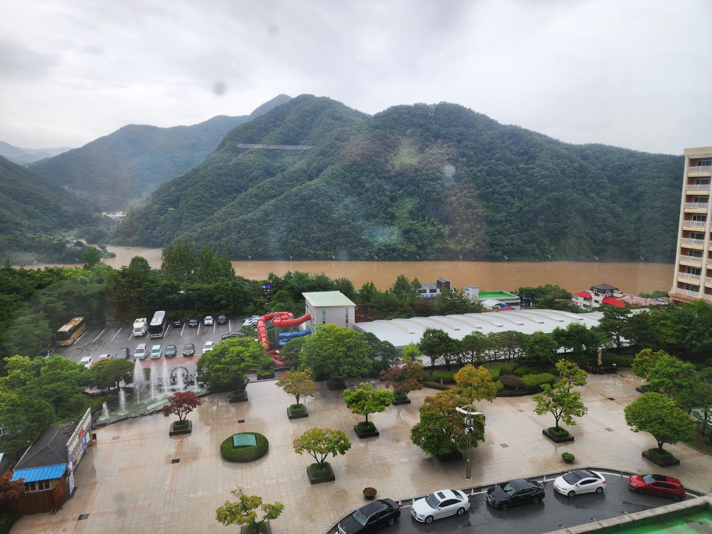 비가 주룩주룩 내리는 계절이므로 경치 구경은 물 건너갔습니다.