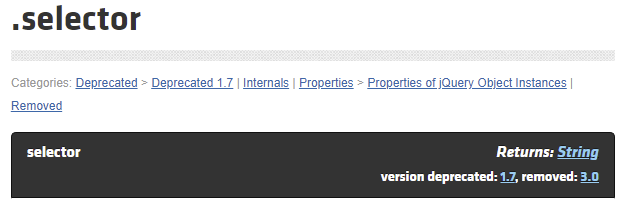 $.fn.newPlugin 같이 플러그인 내부에서 jQuery 오브젝트를 참조할 때 this.selector 로 현재 selector 를 참조할 수 있었던 기능이 없어졌다는 소리다.