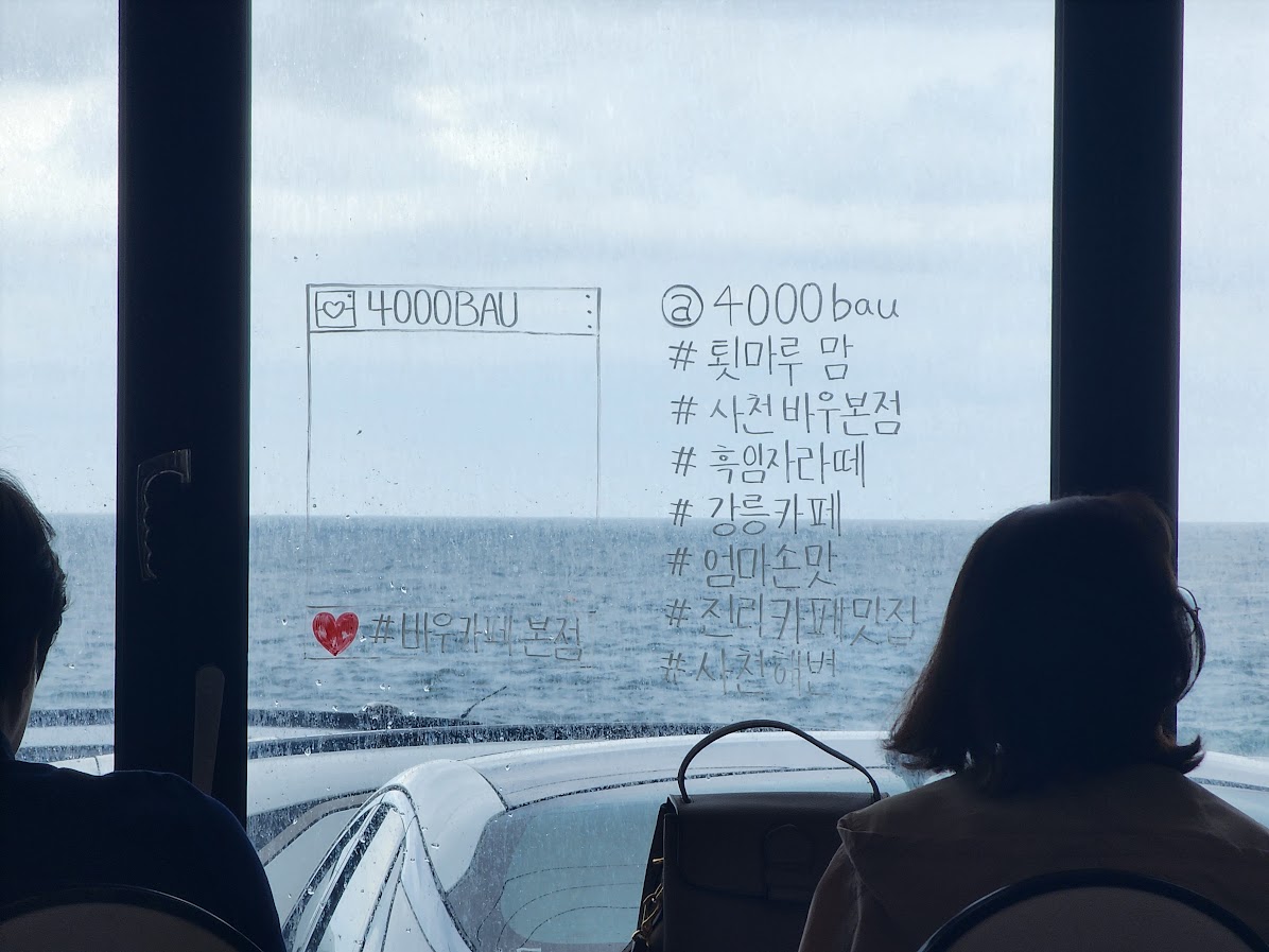 바깥 경치는 기가 막힌데 앞이 주차장이라 자동차 지붕과 바다가 만나는 살짝 슬픈 한국 해변 도로 사정을 감상하며,