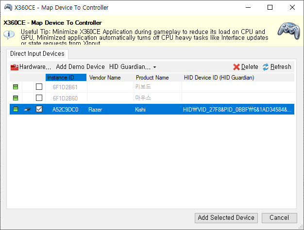키보드 마우스는 해제하고 키시만 선택하고 아래 Add Selected Device 클릭.