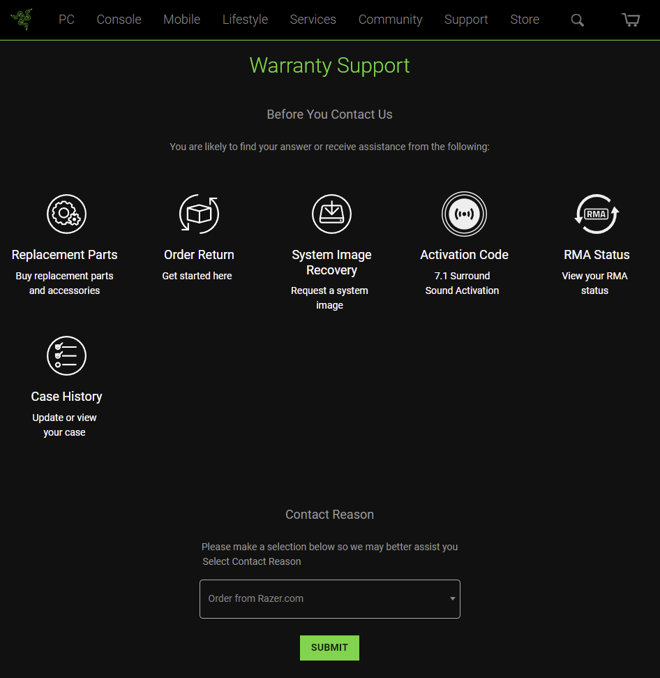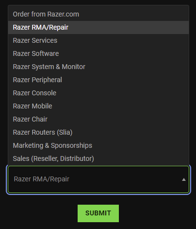 Razer RMA/Repair 선택하고 SUBMIT 을 누릅니다.