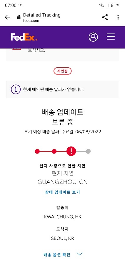 그렇게 중국 광저우에 두 번 붙잡힌 페덱스는 하루 늦은 6월 9일 도착했습니다.