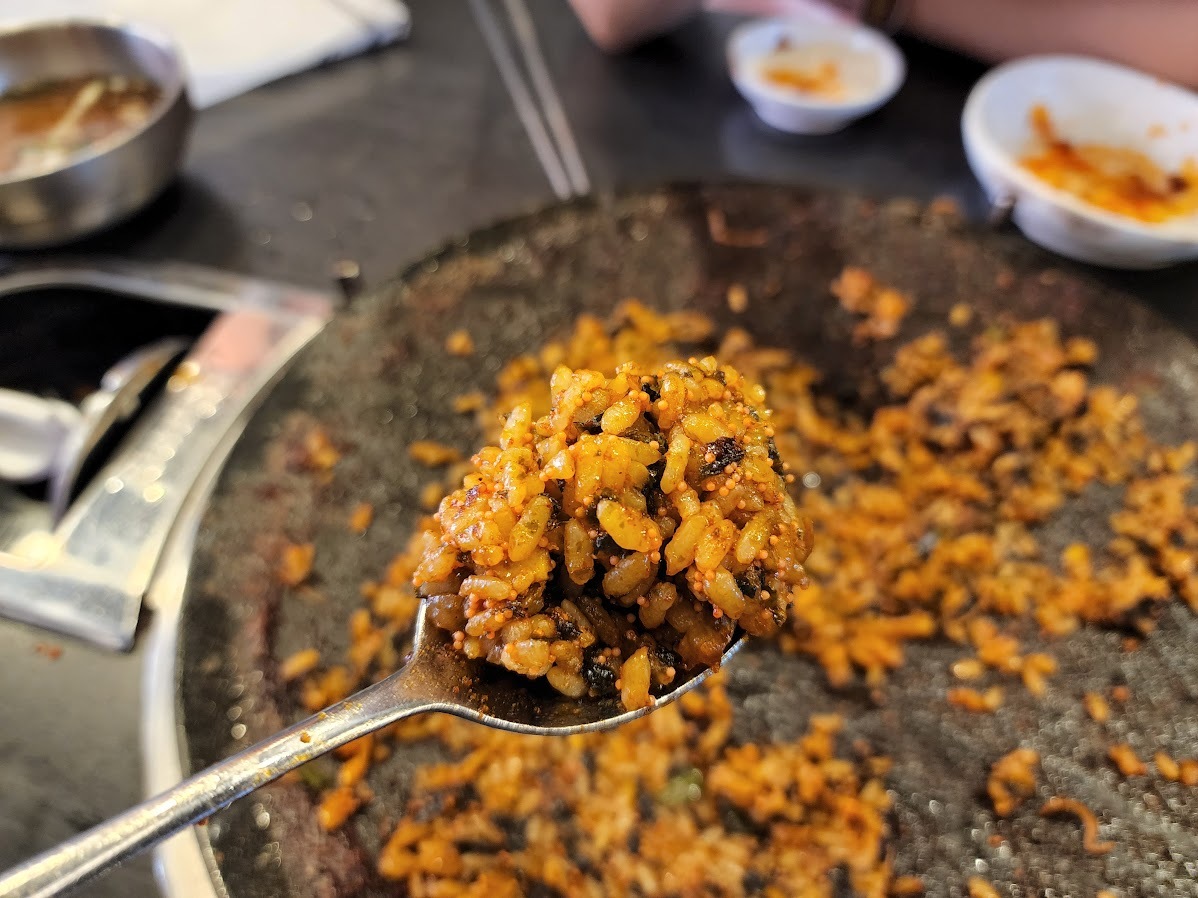 대창 기름이 녹아 있는 쭈꾸미 양념에 날치알 넣고 볶은 맛있는 밥.