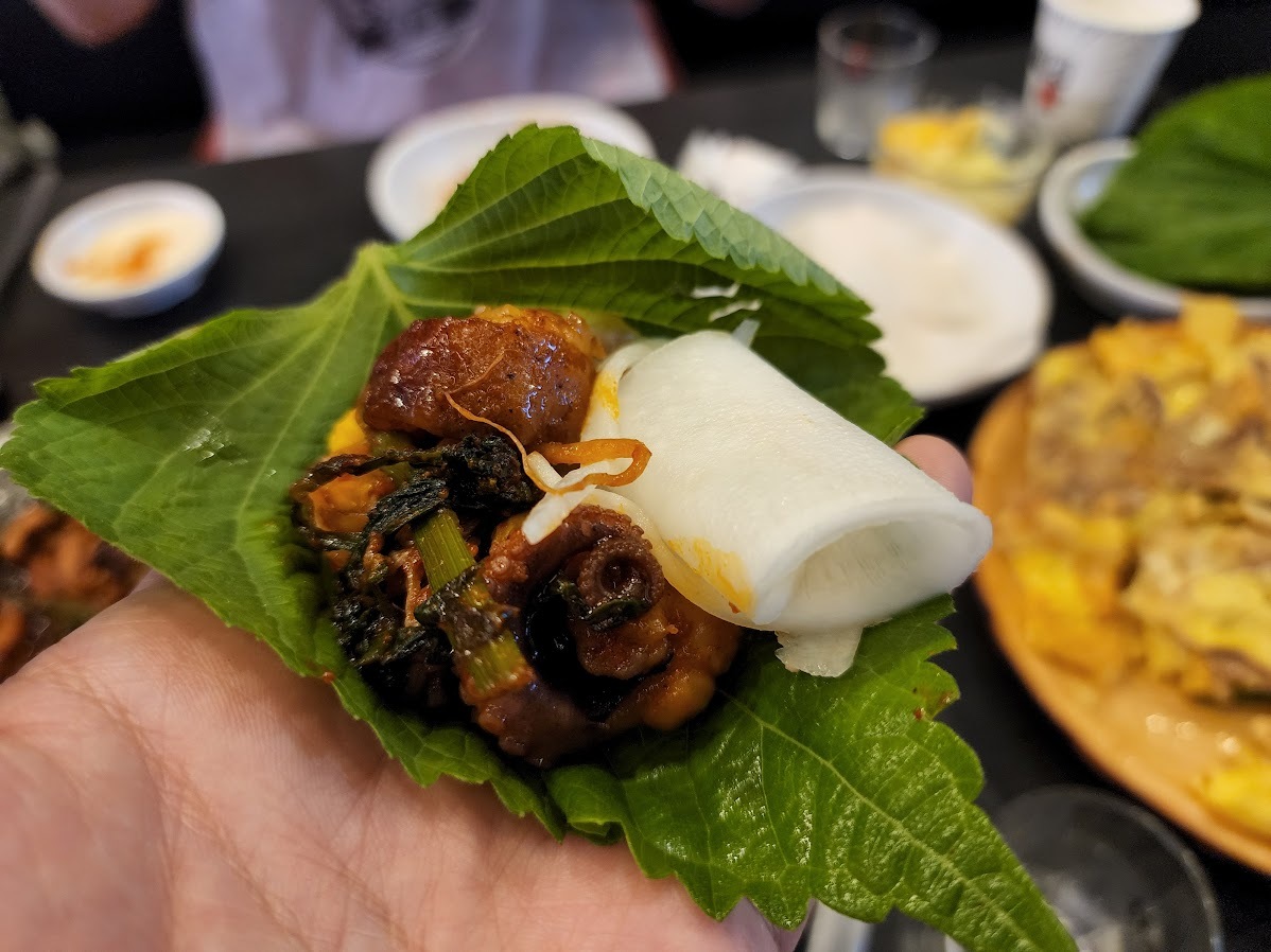 깻잎에 육전을 올리고 대창과 쭈꾸미 무쌈까지 올려서 쌈을 쌉니다.