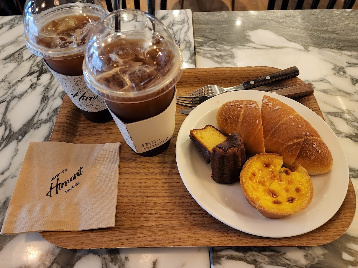 주문한 아이스 아메리카노와 빵이 나왔습니다.