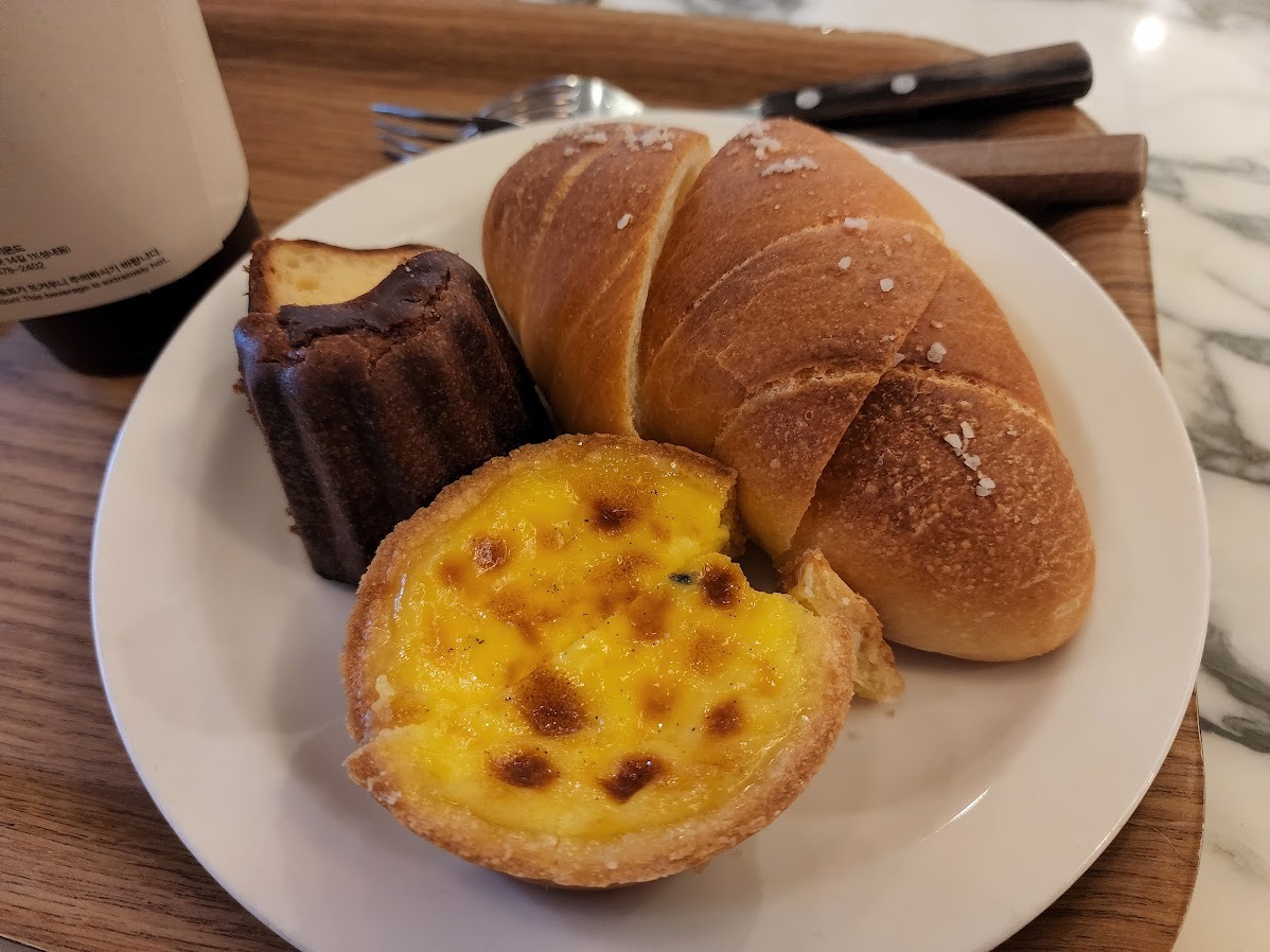 아이스 아메리카노 두 잔에 에그 타르트 하나 까눌레 하나 소금빵 하나.