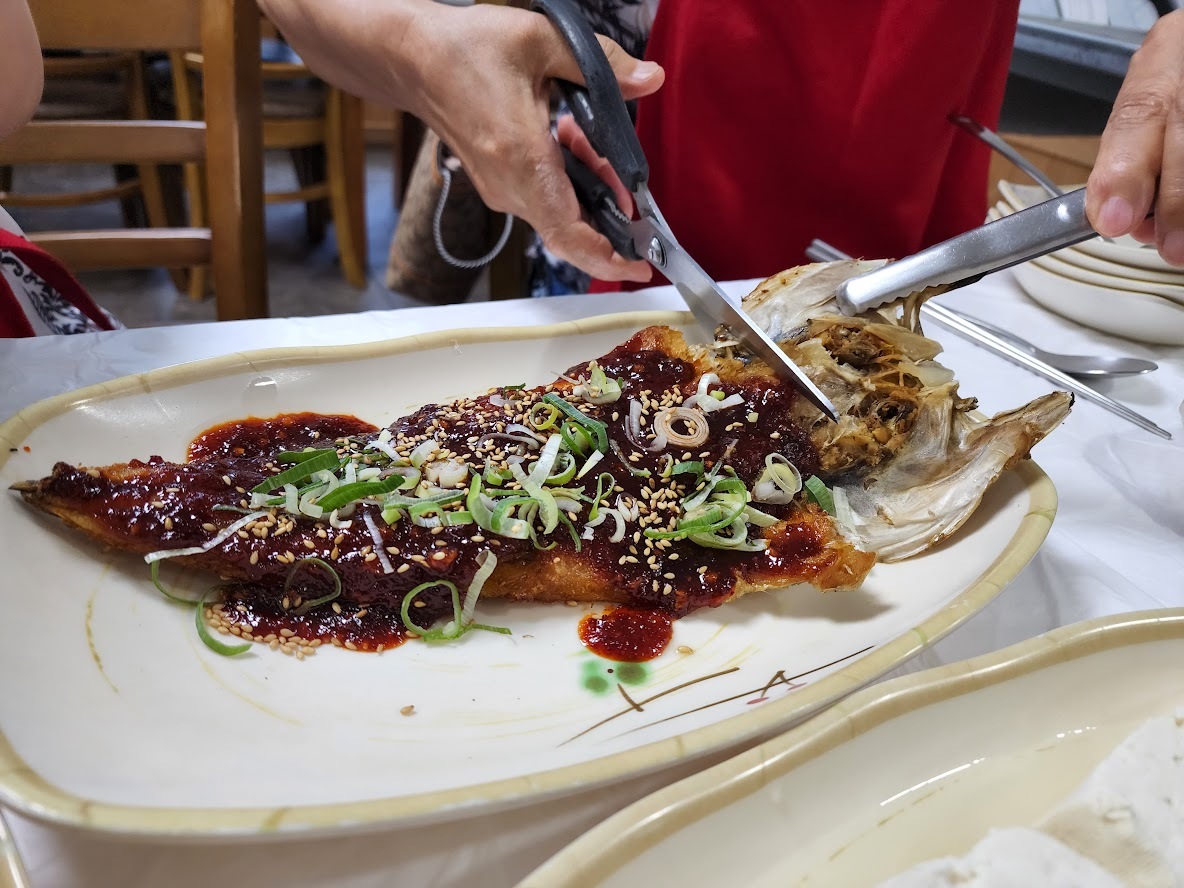 황태 구이, 모두부, 제육볶음, 고등어조림.