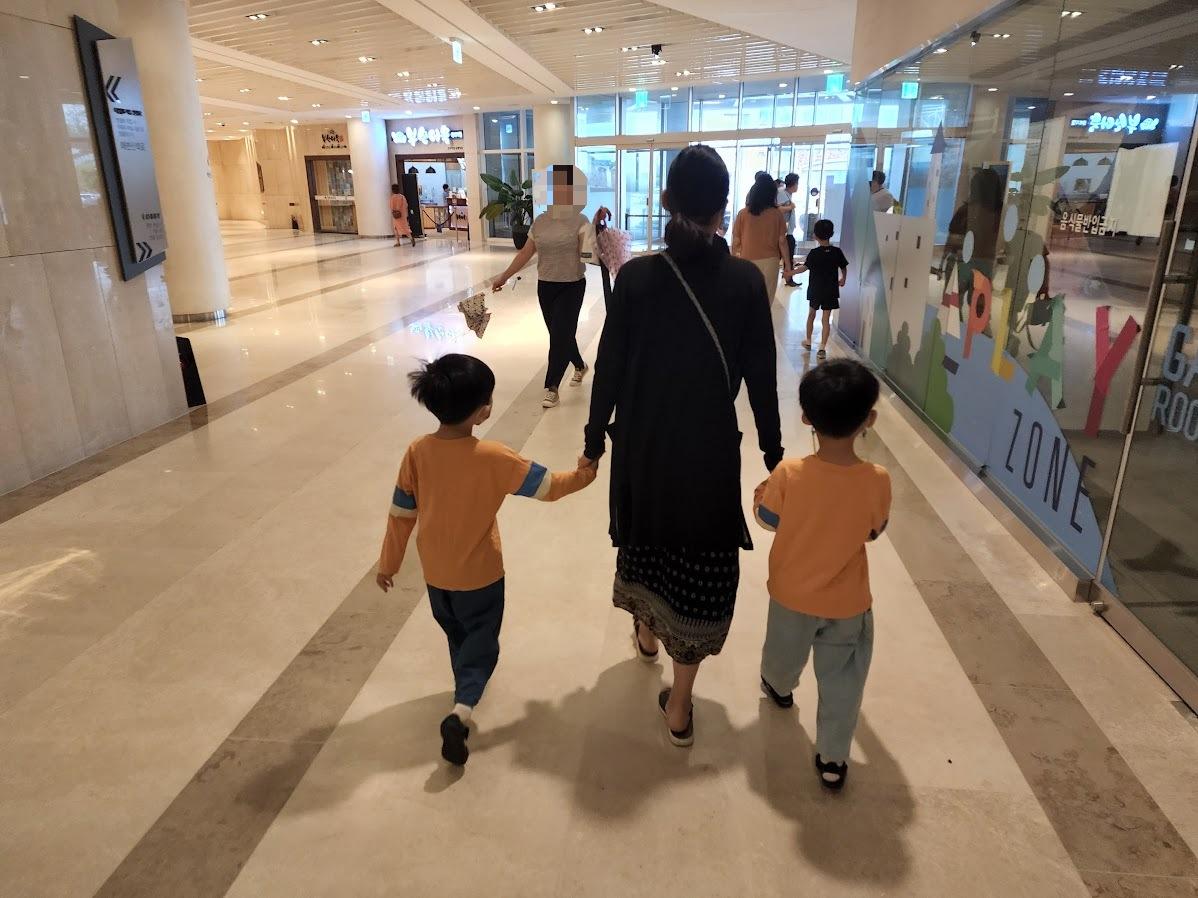 와이프가 아이 둘을 데리고 먼저 들어갑니다.