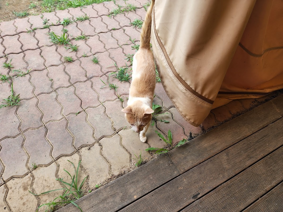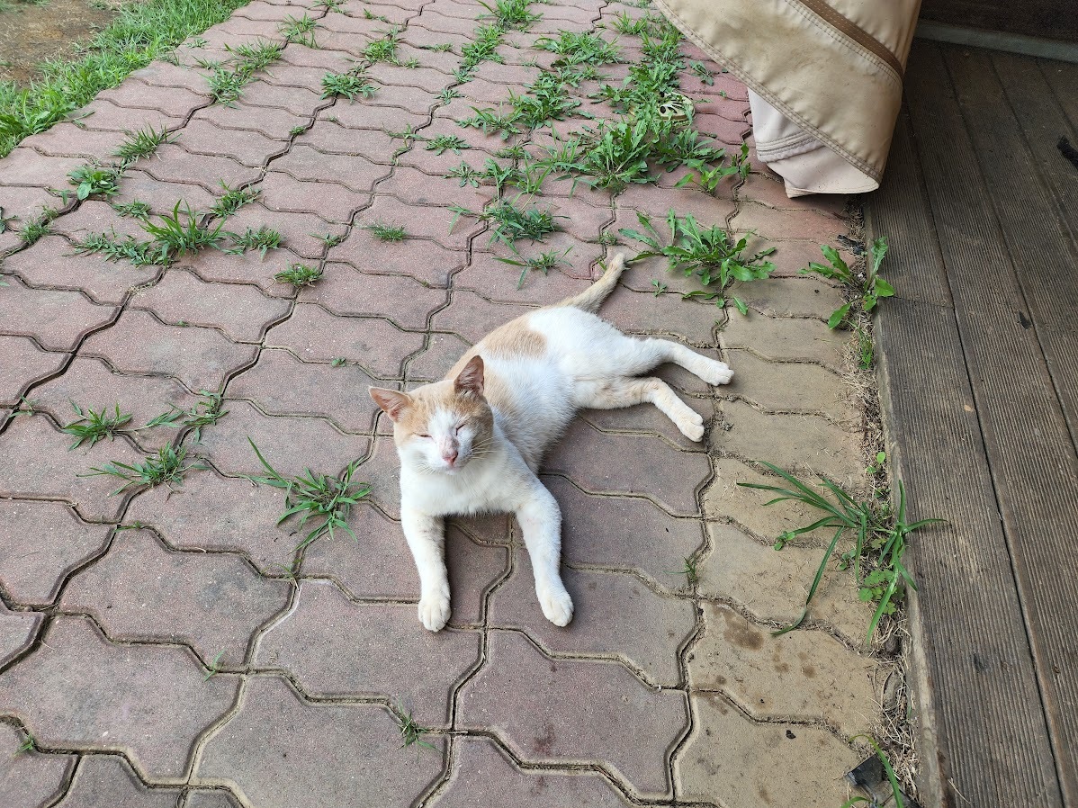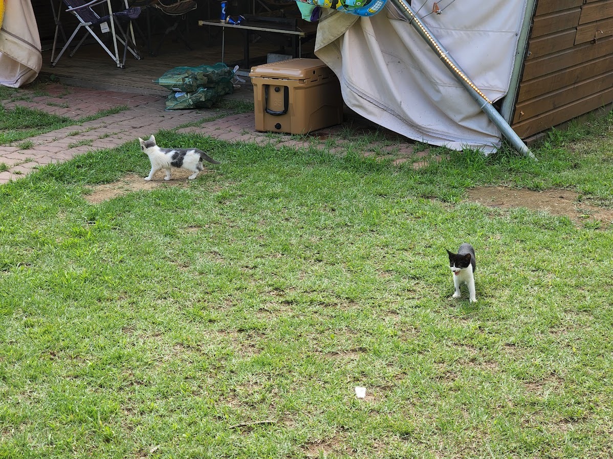 텐트로 돌아오자 고기 장발장으로 추정되는 베이지색 고양이가 반깁니다.