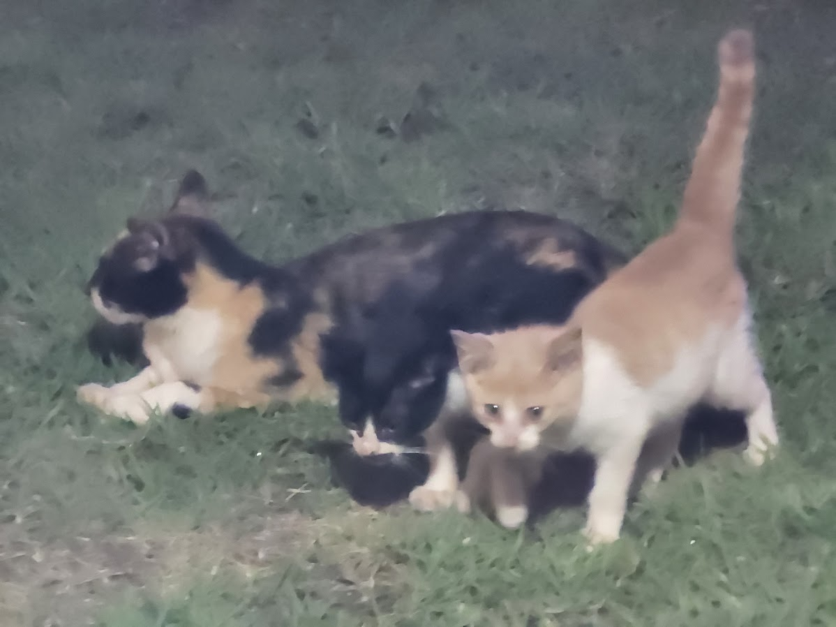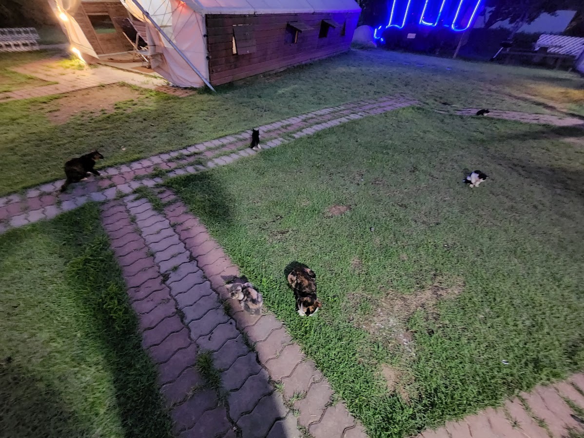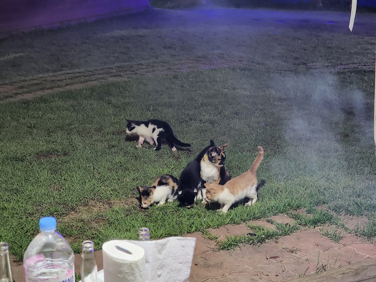 고양이들이 이 텐트 저 텐드 돌아다니며 고기를 얻어먹고 있네요.