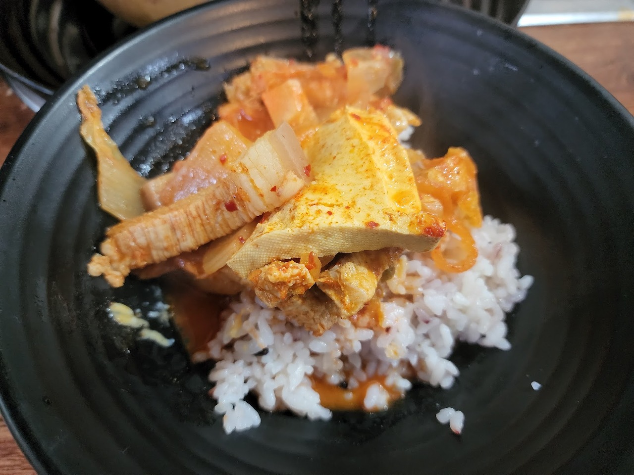 아까 그 김치찌개에 고기와 국물이 적당히 남아 있습니다.