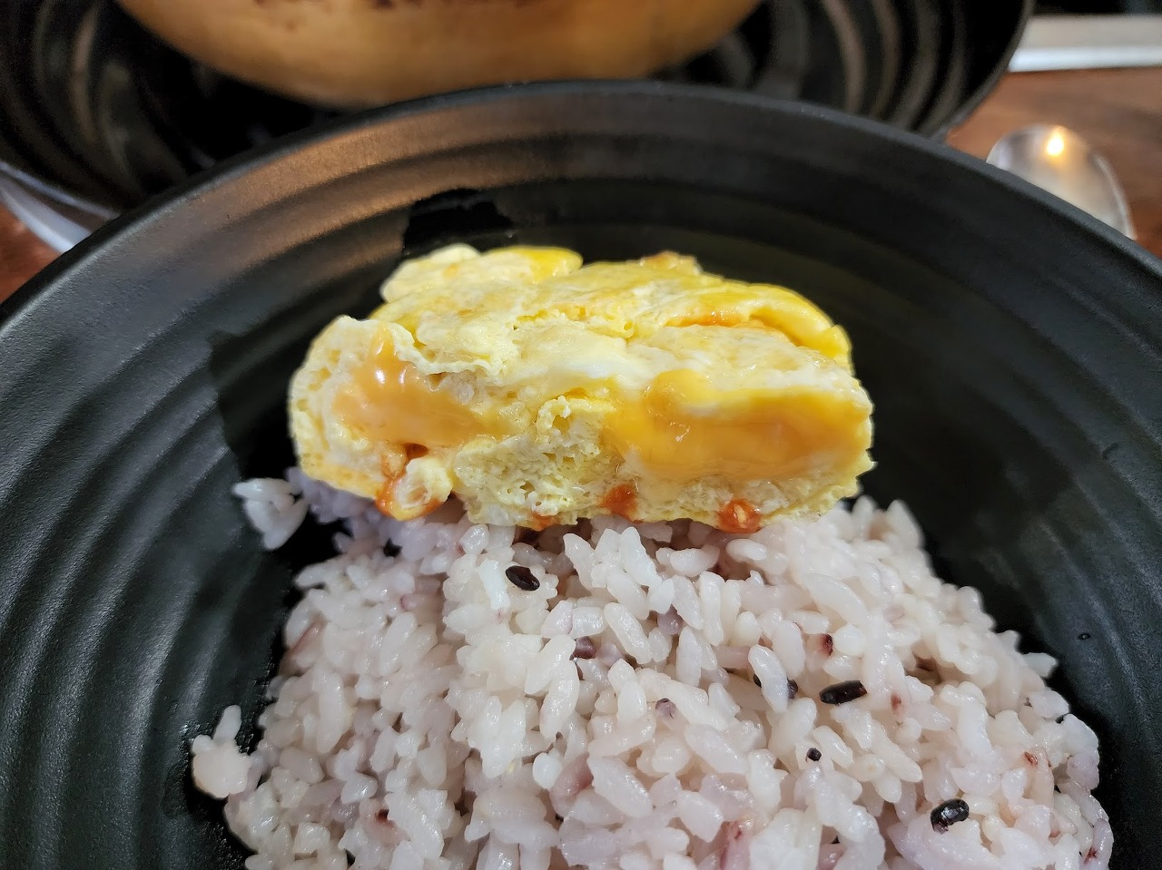 김치찌개가 익기 전에 계란말이로 밥부터 먹습니다.