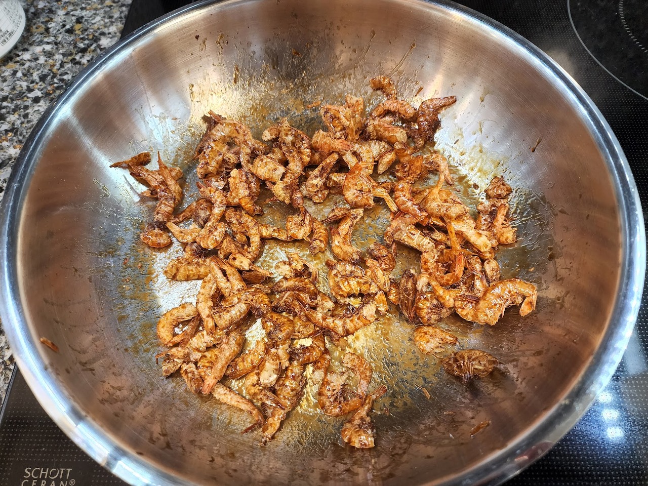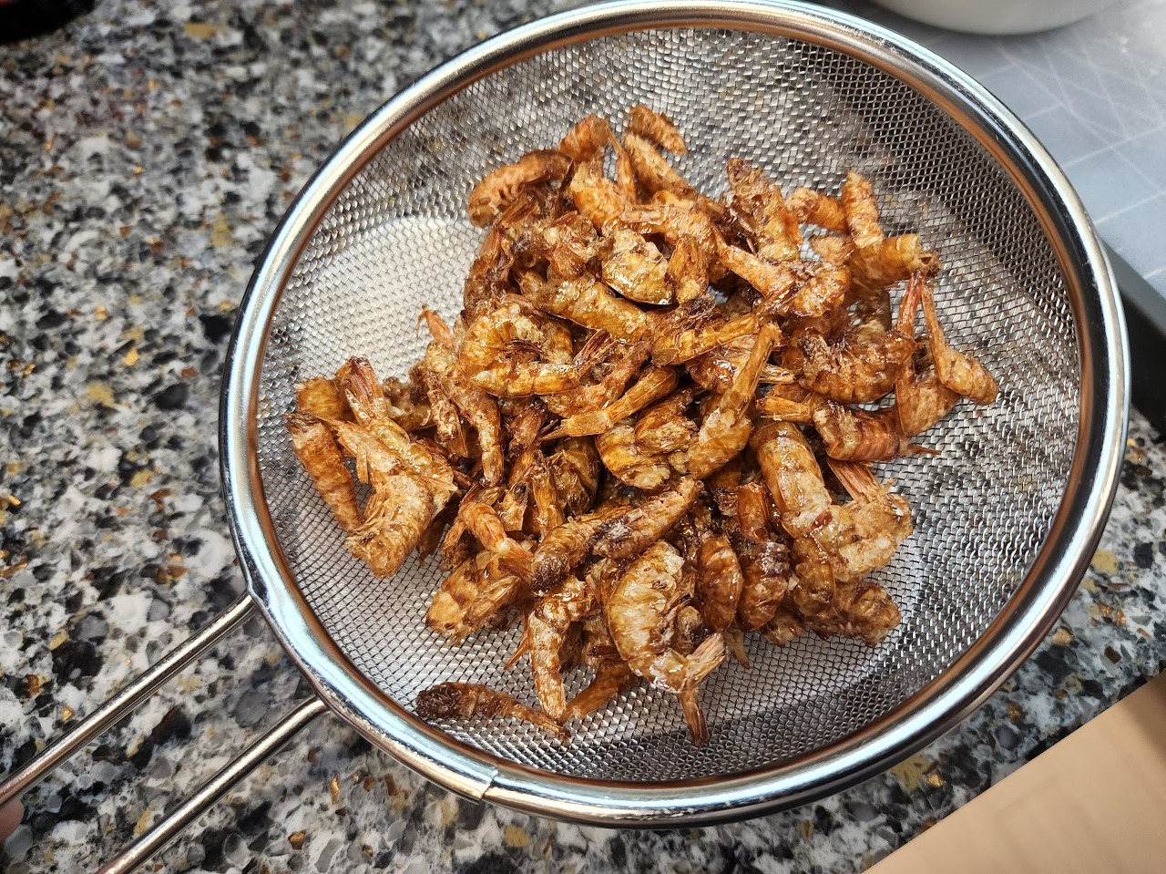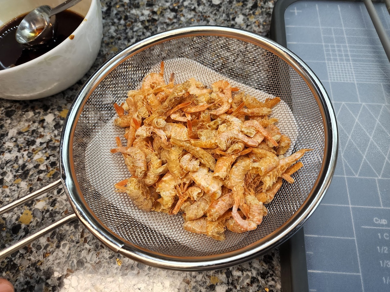 잘 볶아진 새우는 다시 채에 올려 식힙니다.