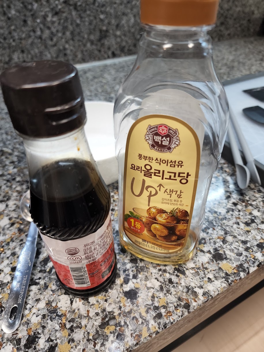 간장은 부모님이 직접 만드신 맛간장을 작은 통에 옮겨 담아 놓은 겁니다.