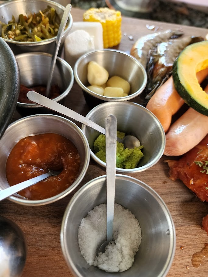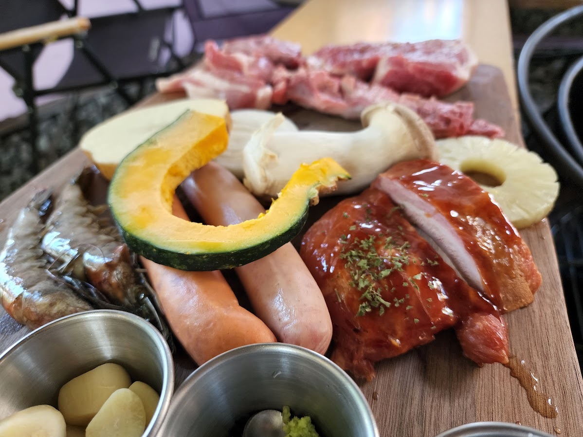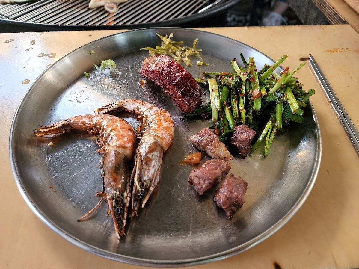 폭립과 소시지와 새우, 그리고 야채류가 있습니다.
