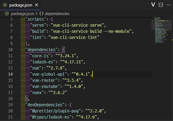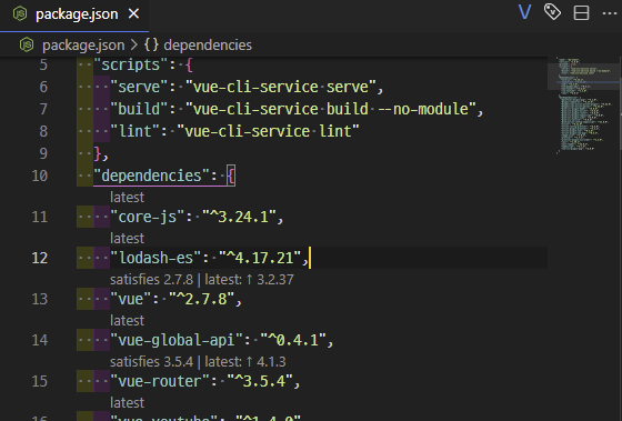 설치하고 난 후 package.json 파일을 열어보면 오른쪽 상단에 V 자 아이콘이 추가된 게 보입니다.