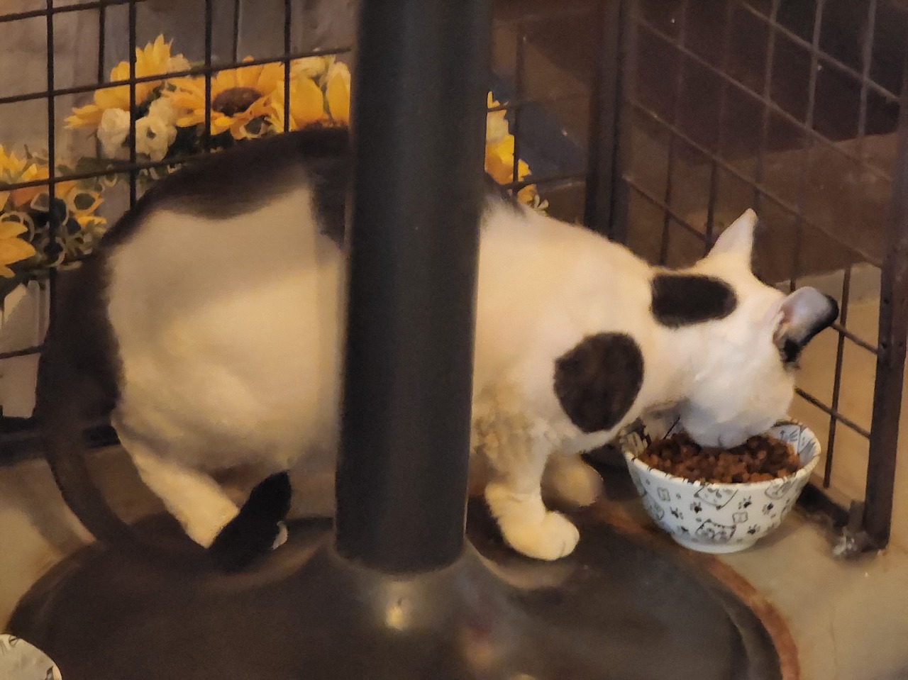 2층 구석에서 고양이 한 마리가 밥을 먹고 있습니다.