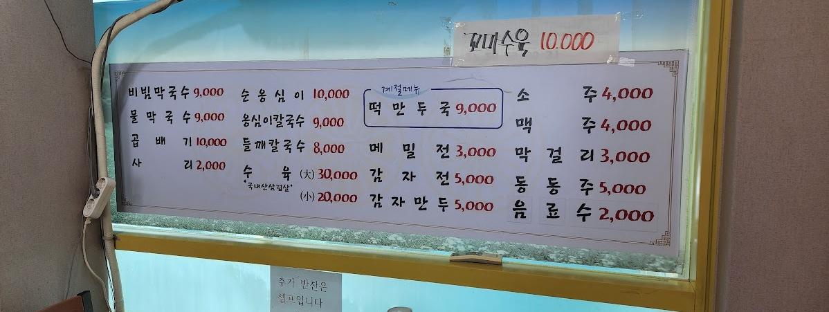 메인은 막국수, 옹심이, 칼국수, 수육, 떡 만두국.
